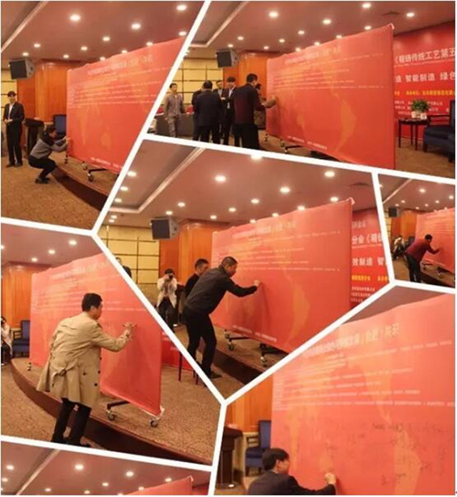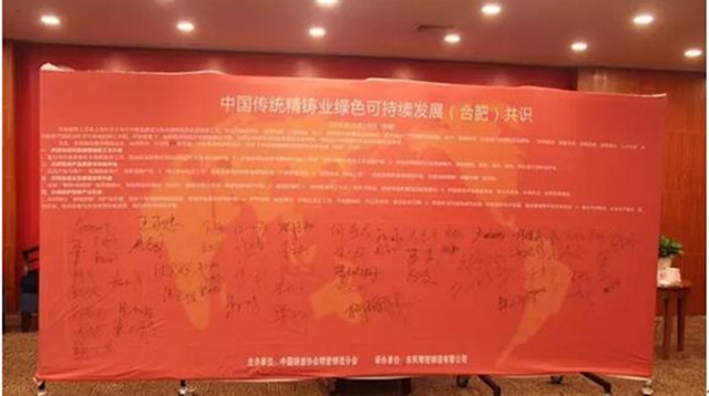 在東風(fēng)精鑄、精鑄分會組織倡議下,10月28日,傳統(tǒng)精鑄第五屆高層論壇順利舉行,來自國內(nèi)重點(diǎn)精鑄企業(yè)、科研院所、社團(tuán)等 95名代表,在安徽合肥共同見識了《中國傳統(tǒng)精鑄業(yè)綠色可持續(xù)發(fā)展合肥共識》簽字儀式,其中60余名代表在幕板上簽字表達(dá)了綠色可持續(xù)發(fā)展的決心。