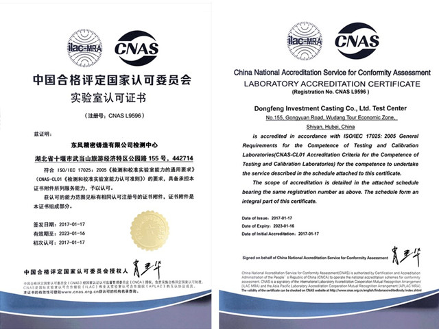 接中國合格評定國家認可委員會(CNAS)通知:東風精密鑄造有限公司檢測中心認可資格已于2017年01月17日獲批準,檢測中心通過CNAS認證。